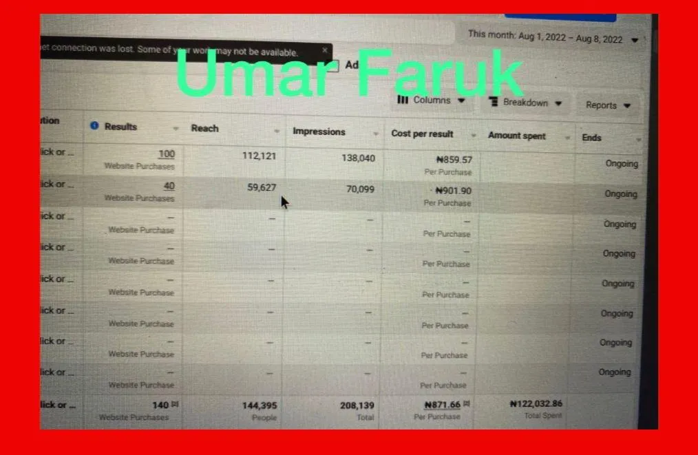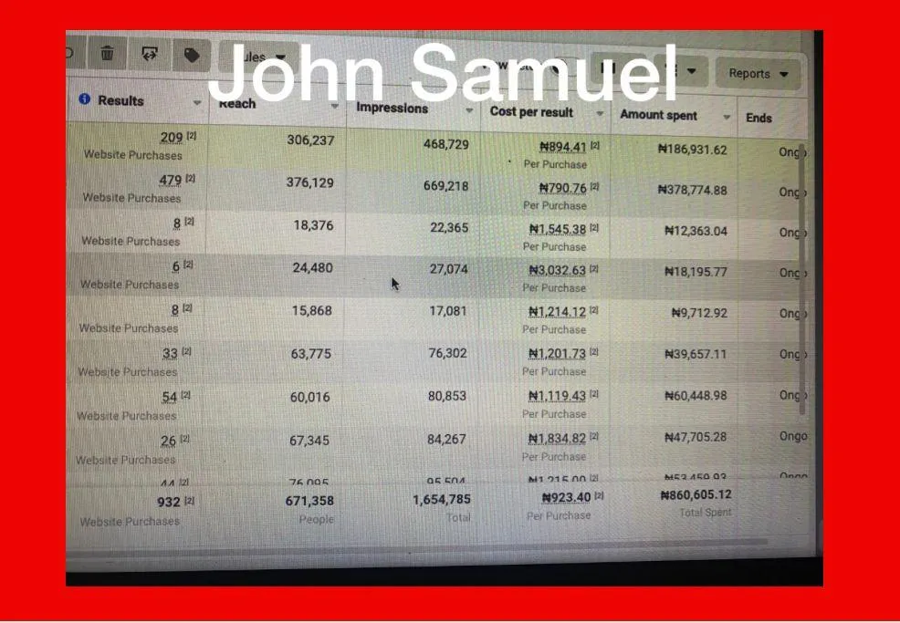The screenshot below is that of an ad expert. His name is John Samuel. He used my CIS strategy and was able to make over 900 sales and a total of 1.7 Million naira pure profit